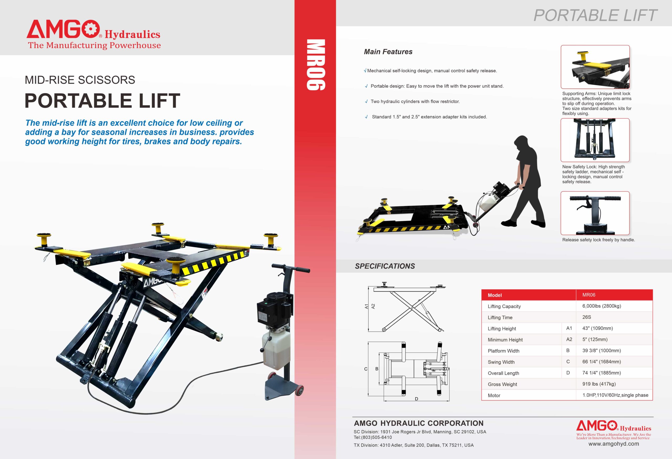 AMGO MR06 is a 6,000 Lb. portable mid‑rise scissor lift that rolls into position and raises cars and light trucks to about 39"–48" (model spec) for brakes, tire, and detailing work. It is powered by a 110/220V power unit with safety locks on both sides.