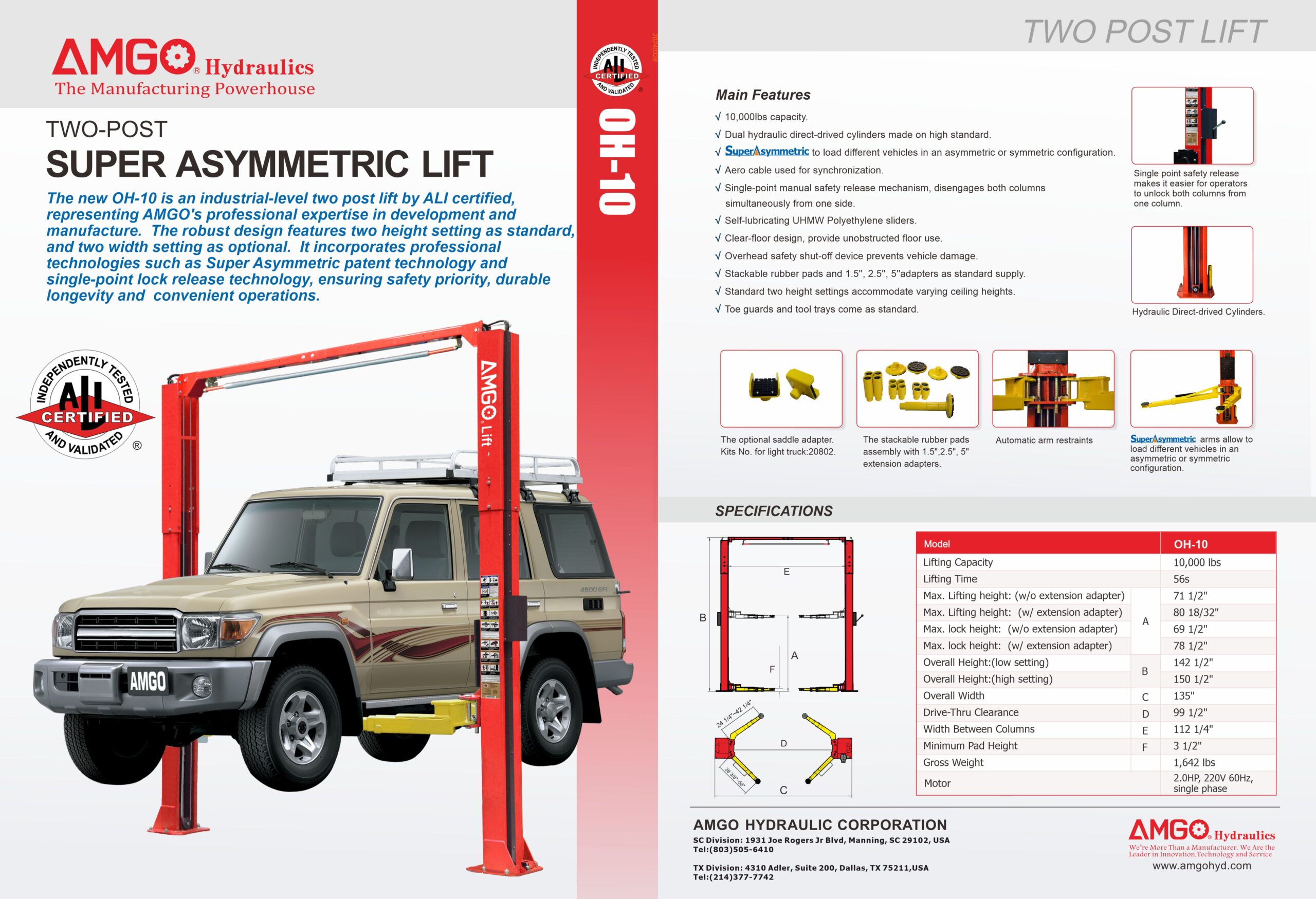 AMGO OH-10 is an ALI-certified 10,000 Lb. clear‑floor overhead 2‑post lift designed for busy service bays that need maximum under‑car access with adjustable height and width settings. Dual direct‑drive cylinders, Super‑Asymmetric arms, and single‑point safety release make it fast to position and safe to operate, even with full‑size SUVs. Overall height is 143 1/8"–151", so it fits most commercial shops that have a 12–13 ft ceiling.