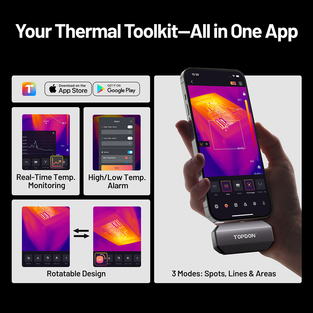 Transform your iPhone, iPad, Android, or Windows device into a professional-grade thermal camera with the TOPDON TC002C Duo. Powered by TOPDON's patented TISR™ image enhancement, this compact powerhouse delivers crisp, detailed thermal visuals that help you spot heat loss, electrical faults, and mechanical issues in seconds. Whether you’re a technician or a DIYer, it’s the portable, plug-and-play solution for fast, accurate inspections anywhere you work.